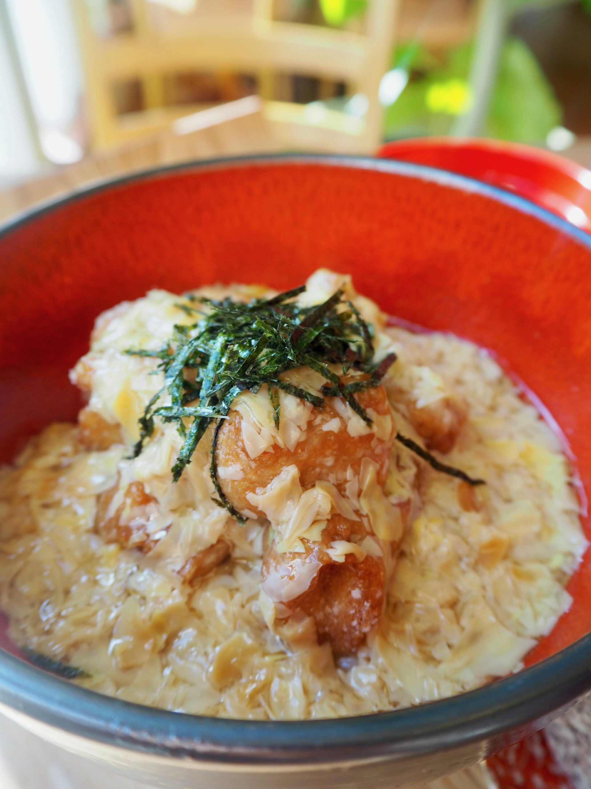 ジューシーな大豆ミートの唐揚げに湯葉たっぷりのふわふわとろとろ餡をたっぷり掛けた人気のどんぶりメニューです♡