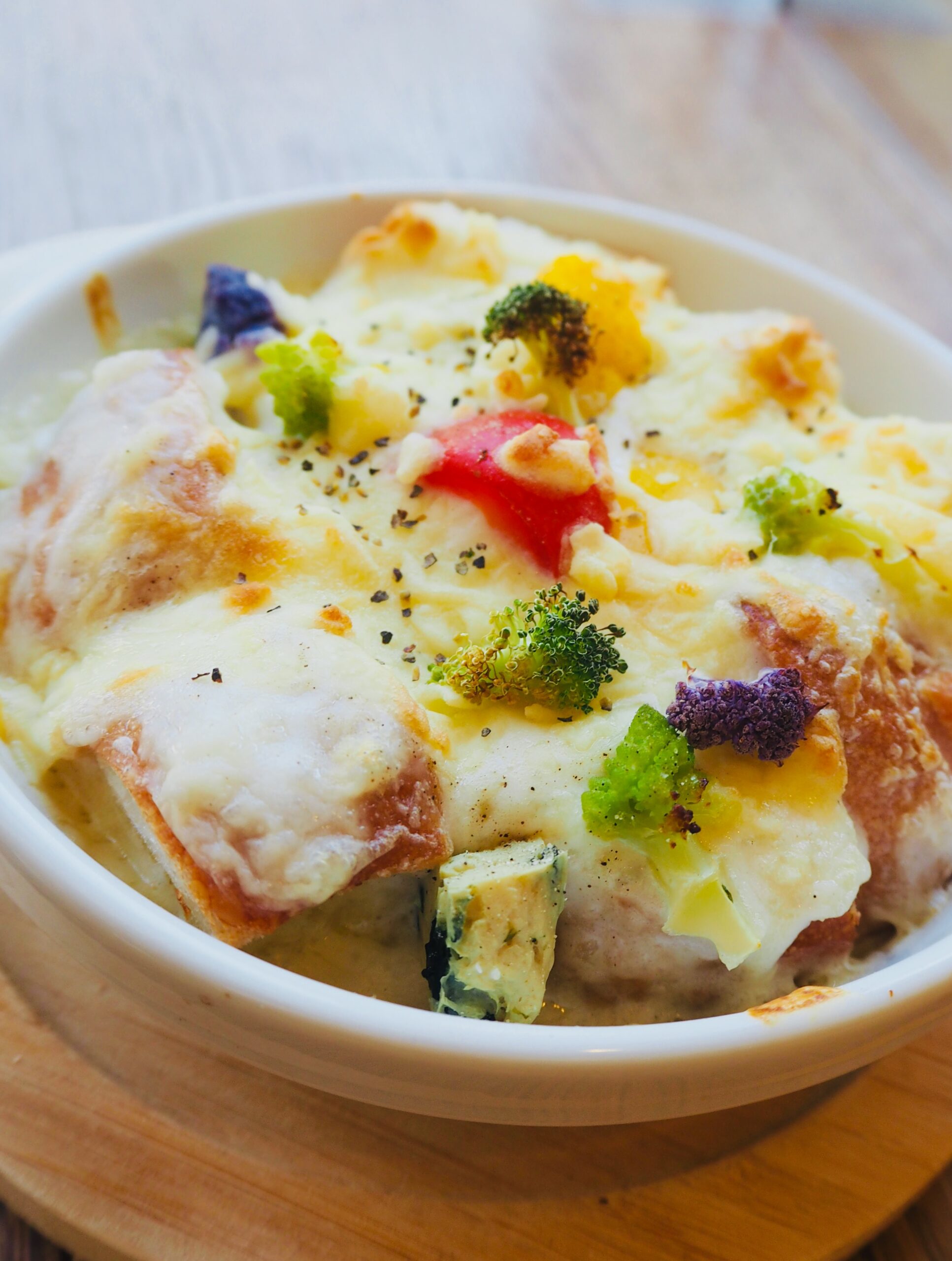 もっちりフランスパンにポテト入りオリジナルベシャメルソースとモッツァレラチーズをたっぷり掛けて焼き上げました♡熱々をどうぞ…