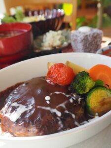 SAISHOKUKENBI オリジナルベジハンバーグはジューシーで柔らかい人気のハンバーグです☆ 季節の野菜たっぷり副菜も嬉しい贅沢ランチです♪